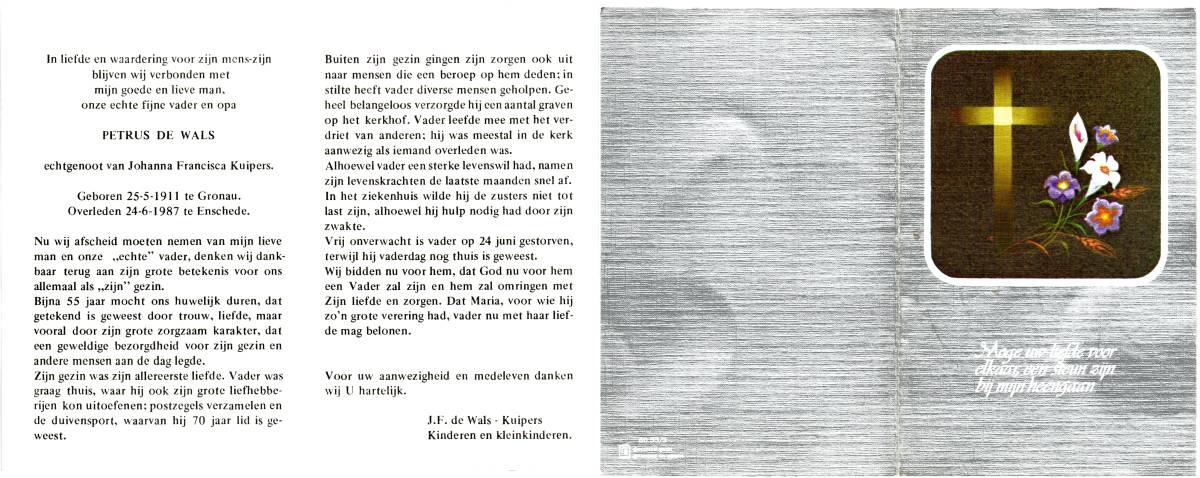 WALS, de, Hendrikus Jacobus, geboren op 18-5-1910 te Lonneker, overleden op 6-2-1980 te Losser op 69-jarige leeftijd, gecremeerd op 11-2-1980 te Usselo.