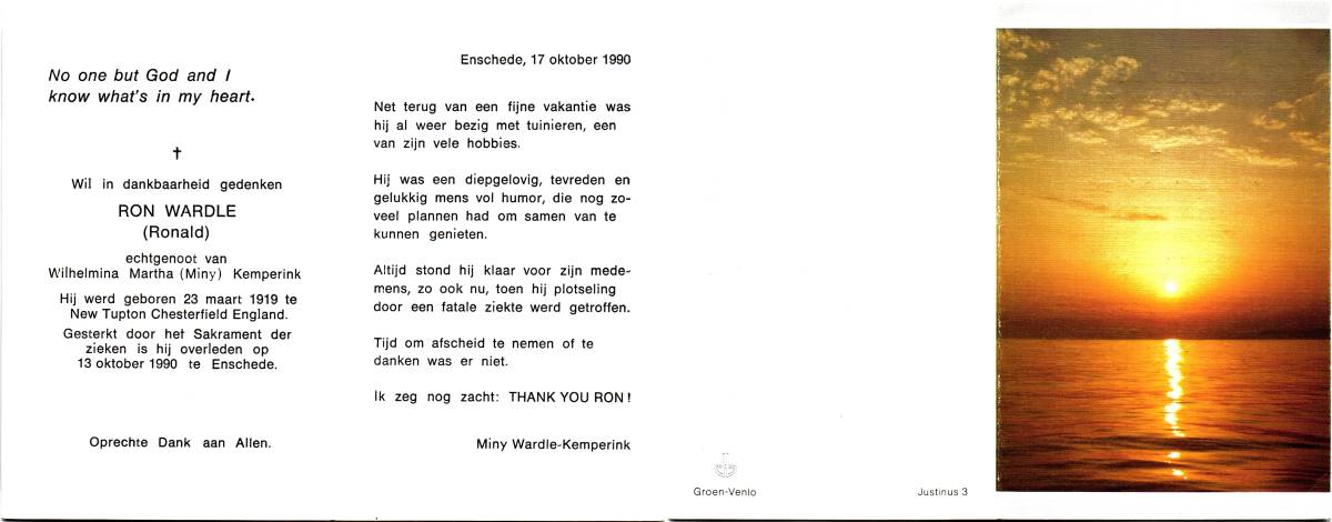 WARDLE, Ron (Ronald), geboren op 23-3-1919 te New Tupton Chesterfield, GB, overleden op 13-10-1990 te Enschede op 71-jarige leeftijd.