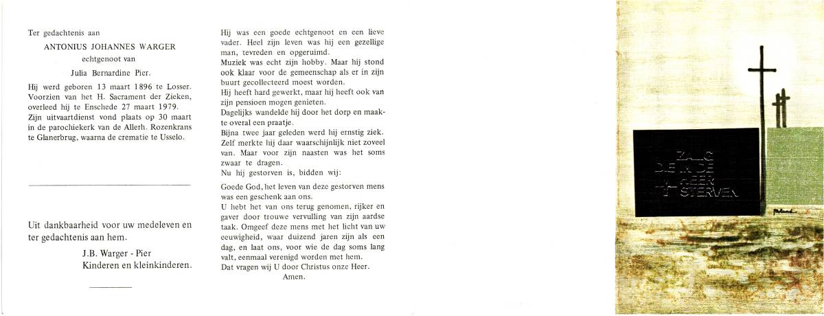 WARGER, Antonius Johannes, geboren op 13-03-1896 te Losser, overleden op 27-3-1979 te Enschede op 83-jarige leeftijd, gecremeerd op 30-3-1979 te Usselo.