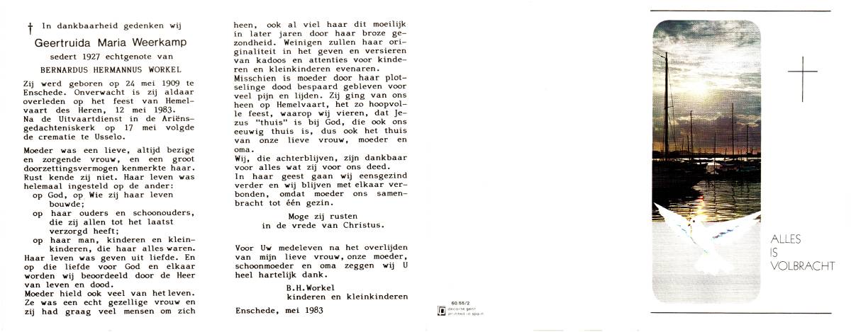 WEERKAMP, Geertruida Maria, geboren op 24-5-1909 te Enschede, overleden op 12-5-1983 te Enschede op 73-jarige leeftijd, gecremeerd op 17-5-1983 te Usselo.